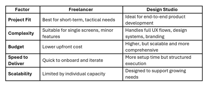 If you’re bootstrapping and moving fast, a talented freelancer can be your secret weapon. If you’re building toward growth or need a partner who can plug into product strategy, a design studio may be the better long-term bet.