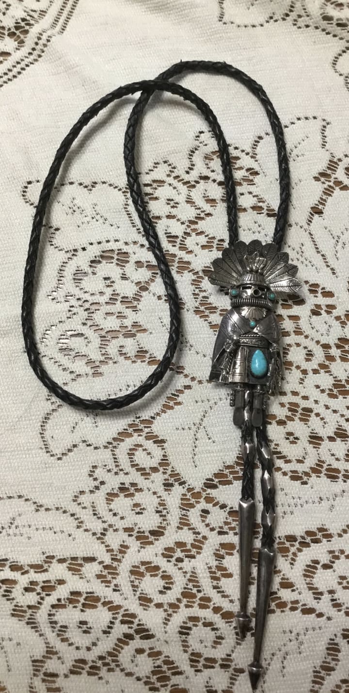 The above bolo tie is my personal tie, traded by my wife and me in Quartzsite one year for glass beads .