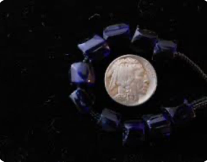 Blue beads (Russian blue) are antique, cobalt or cornflower blue faceted glass beads, predominantly produced in Bohemia (modern-day Czech Republic) and Venice during the mid-to-late 1800s. Primarily used in the 18th and 19th-century fur trade by Russian traders with Indigenous people in the Pacific Northwest and Alaska, these beads are highly valued collectibles