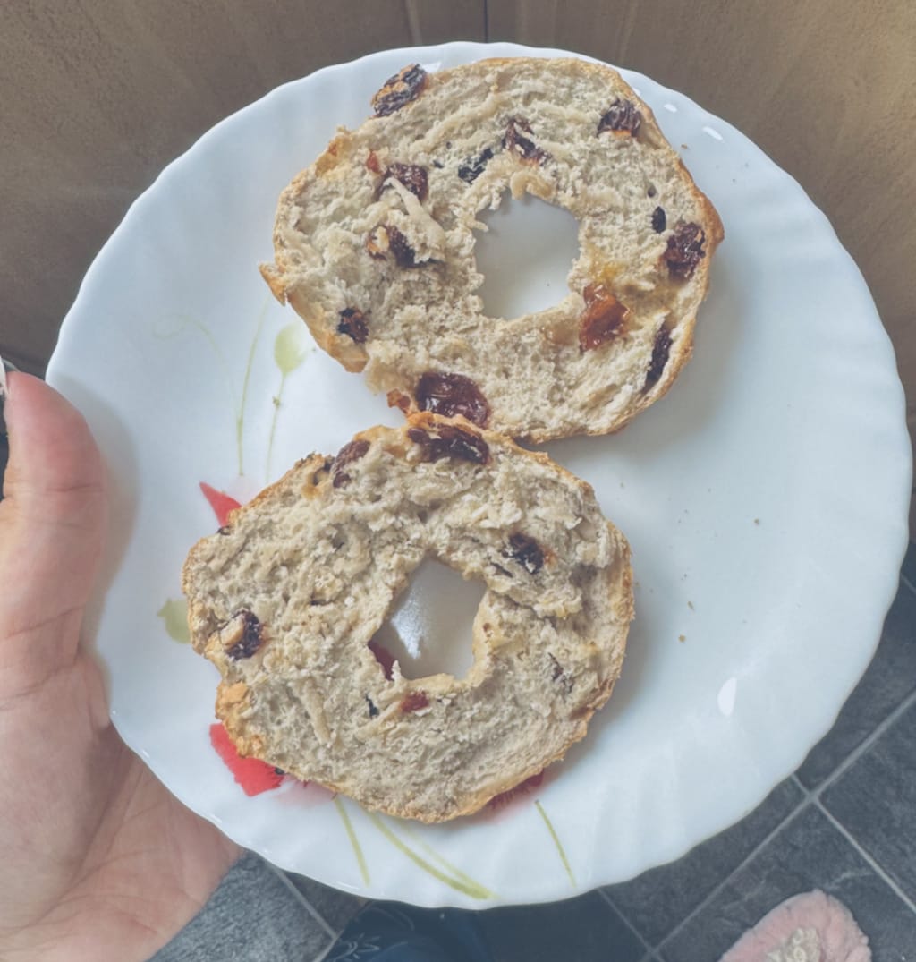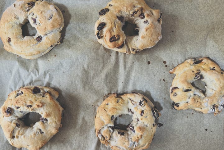 This recipe makes approximately six or seven large bagels and of course, you can swap the raisins out for just about anything. You can also use flavoured yogurt if you want because it will add some taste without you having to overstuff the bagel, which can lead to dodgy baking times.