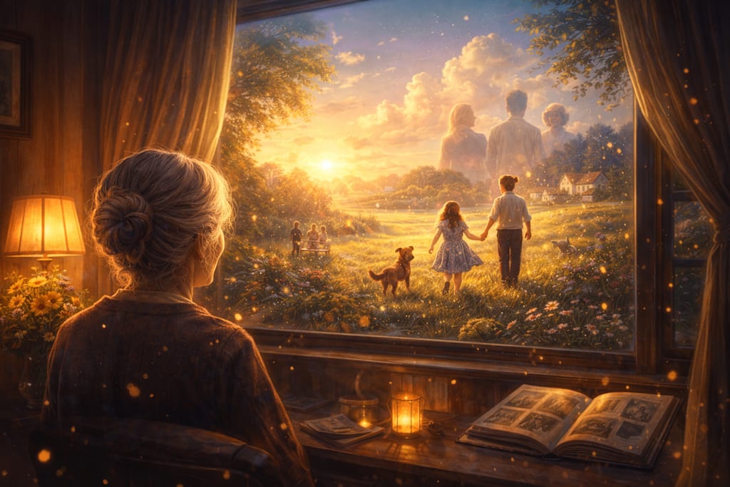In a way, it was comforting to know that she’d soon be going back to the place she’d missed ever since she’d left childhood. She would see her husband again, her brothers and sister, her parents and grandparents. Her childhood pets, and her poor classmate who had left the story when he caught pneumonia on the threshold of middle age.
