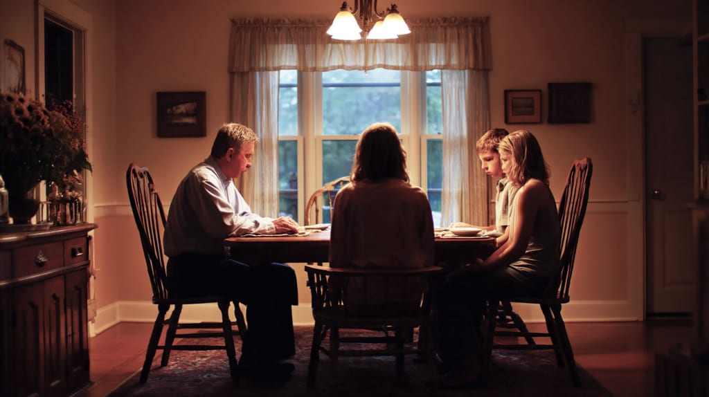 His mother moved between the stove and the table, setting plates down in her usual rhythm. His father sat at the far end, already eating, eyes lowered. His sister swung her legs, waiting.