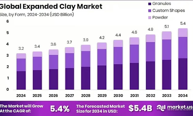 Overview The Expanded Clay Market is poised for steady growth over the forecast period, rising from USD 3.2 billion in 2024 to nearly USD 5.4 billion by 2034. This growth reflects a CAGR of 5.4% from 2025 to 2034, driven by increasing demand across construction, horticulture, insulation, and lightweight concrete applications. The market’s upward trajectory is supported by the material’s durability, thermal efficiency, and eco-friendly properties, making expanded clay an increasingly preferred solution across diverse industrial and infrastructure uses worldwide.