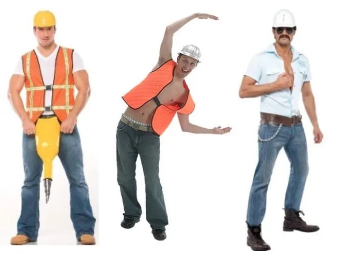 There are not many male construction worker costumes available for purchase. Typically parts of the costume are sold individually rather than as a whole ensemble. A jackhammer, hard hat, and orange vest are relatively easy to find, but the rest is up to the men already owning the clothes. The few complete sets that men could purchase were focused on the Village People rather than the construction worker profession.