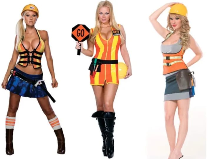 Women were able to buy plenty of full construction worker outfits, but they are not something likely to be worn on the job. One costume remembered the reflective vest but forgot the shirt to actually offer any protection. I have seen plenty of female sign holders stop or slow down traffic, but none of them were dressed even close to the Halloween version. In fact, her dress does more to stop traffic than the little sign she is given.
