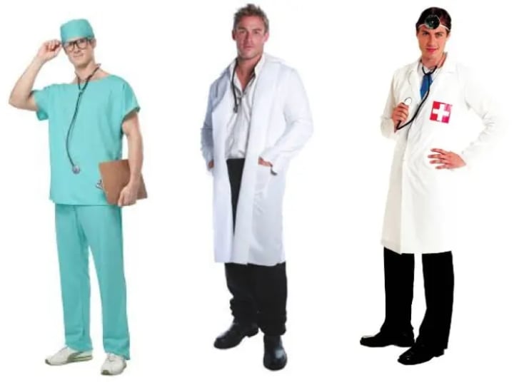 Doctor and nurse costumes were as expected. The male doctors get their lab coats and stethoscopes. They might have an operating cap or a head mirror. The nurse costumes were so abundant and varied that these four images don’t dent the surface of design options.