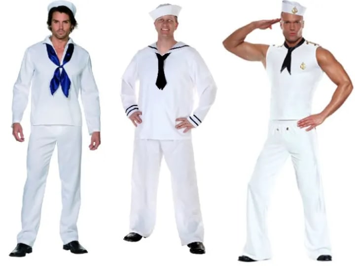 Sailor costumes were very plain for men. The white pants, shirt, and hat are accented with either black or blue. They have a matching neckerchief and the option of sleeves or no sleeves.