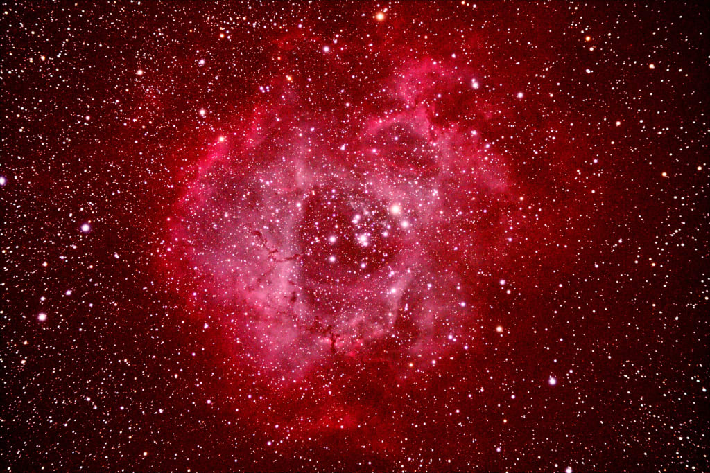 Spanning approximately 130 light-years in diameter, the Rosette Nebula, also known as Caldwell 49, is a vast cloud of gas and dust. Situated about 5,000 light-years away from Earth, this stellar nursery is predominantly composed of hydrogen gas, with traces of other elements like oxygen, sulfur, and nitrogen. Its distinctive rose-like shape, from which it derives its name, is the result of the energetic radiation from a cluster of hot, young stars at its core, ionizing and illuminating the surrounding gas.