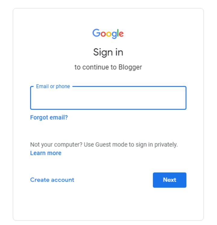 Here you have two options create a blog or sign. Click on any option and it will redirect you to the next page where you have to sign in with your Gmail id. You have to enter your Gmail id and password to access the blogger.