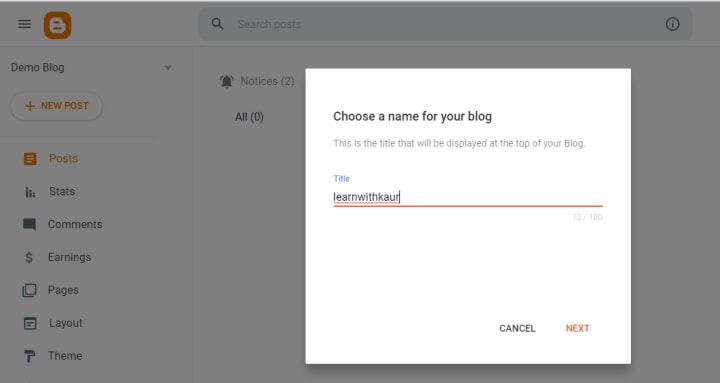 Enter the name of your blog. The name means the title of the blog. Whatever title you want to give to your blog you can enter here. According to your niche, choose the name of your blog. For the sake of this article, I am going to enter "learnwithkaur" as the title of the blog.