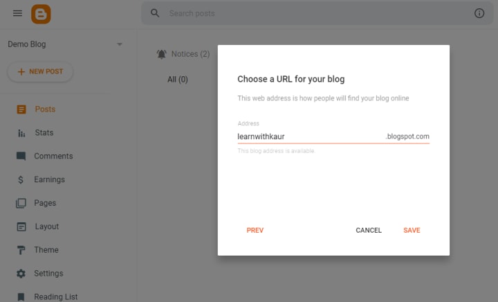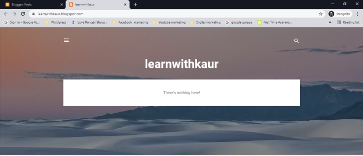 👆 This is how your blog will look like once you have done with the basic blog setup that you have learned in this article. Nothing is shown here because we have not added any theme and content yet. Here you will see two things The title " learnwithkaur" and URL learnwithkaur.blogspot.com that we have chosen during the setup of a blog.