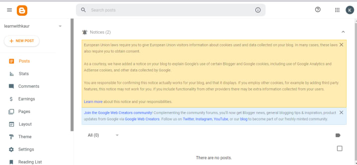View blog - To view the blog that how it looks like simply click on the view blog option. Here is the view of the "learnwithkaur" blog that I have just created for the sake of this guide.