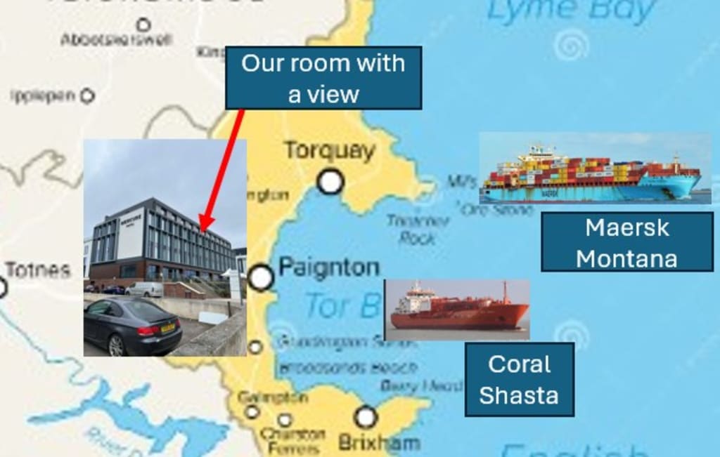When we checked in there was a large orange coloured commercial ship lying about a mile offshore. At three in the morning, she was still there. An array of white and sodium coloured lights making her look like a Christmas tree lying down for a rest until it was needed again. She is the "Coral Shasta", what a great pen name for a female thriller writer, registered in the Marshall Islands. They are somewhere in the Pacific between the Philippines and Hawaii. Her cargo is liquid propane gas (LPG) from somewhere to somewhere undecided which could explain why she is at anchor in Torbay far from the Marshall Islands and any specialist quaysides able to accept her cargo.