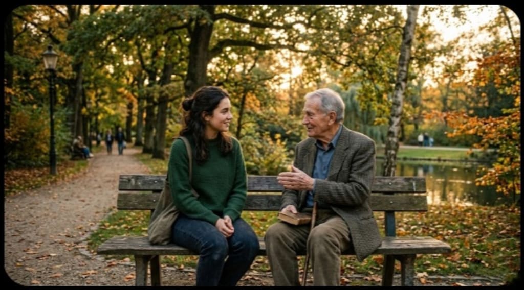 I turned slightly and saw an elderly man, probably around sixty-five or seventy years old. His hair was gray and slightly messy, and he wore a simple jacket that looked a little worn but comfortable.