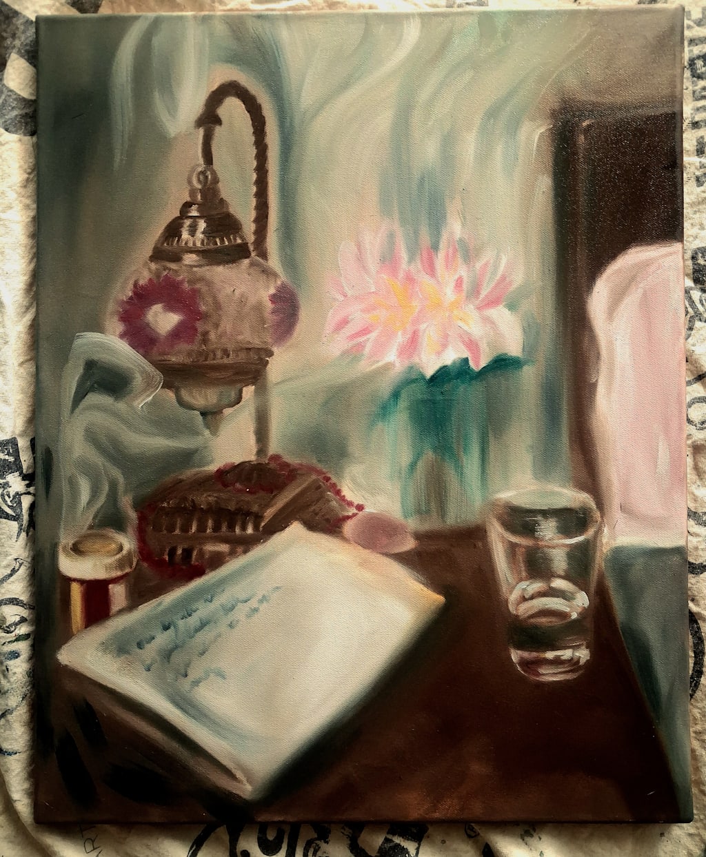 Oil painting still life of my bedside as I wrote this