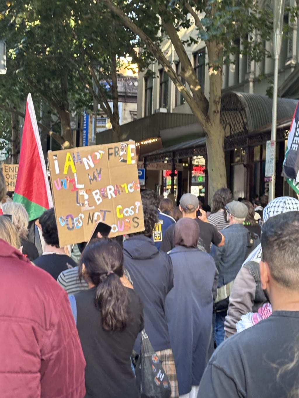 Naarm (melbourne), 12th february 2026 / protest sign reads: I am not free until my liberation does not cost yours / photo by me